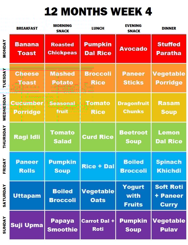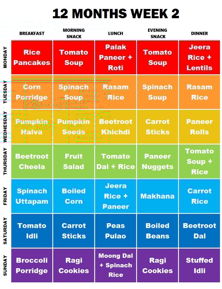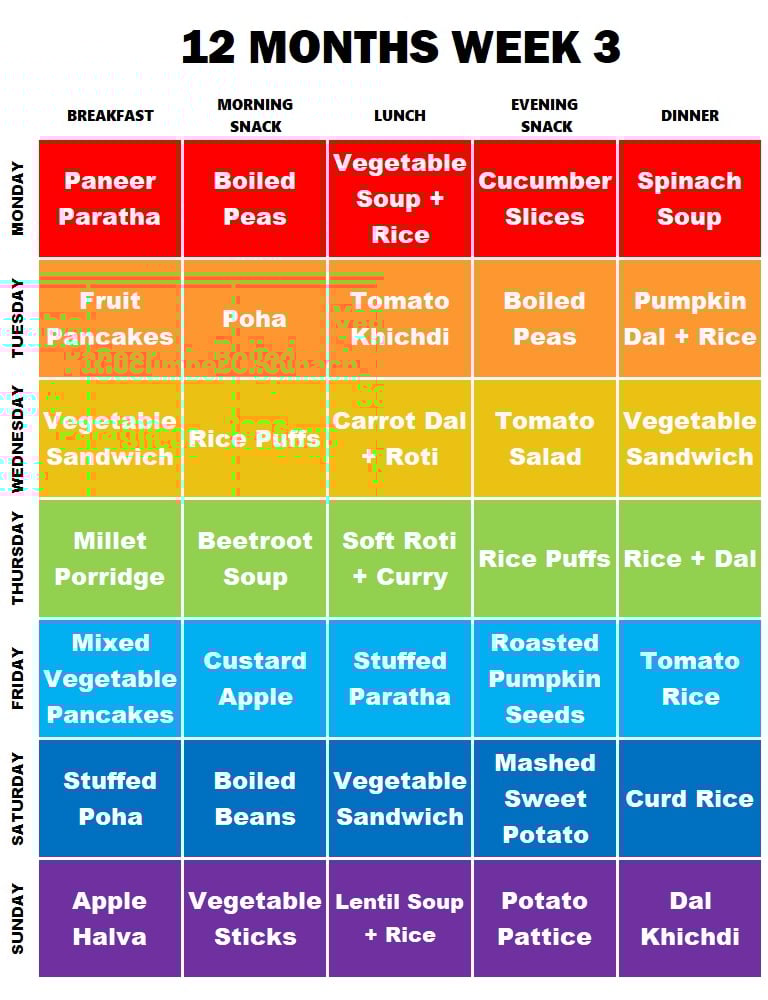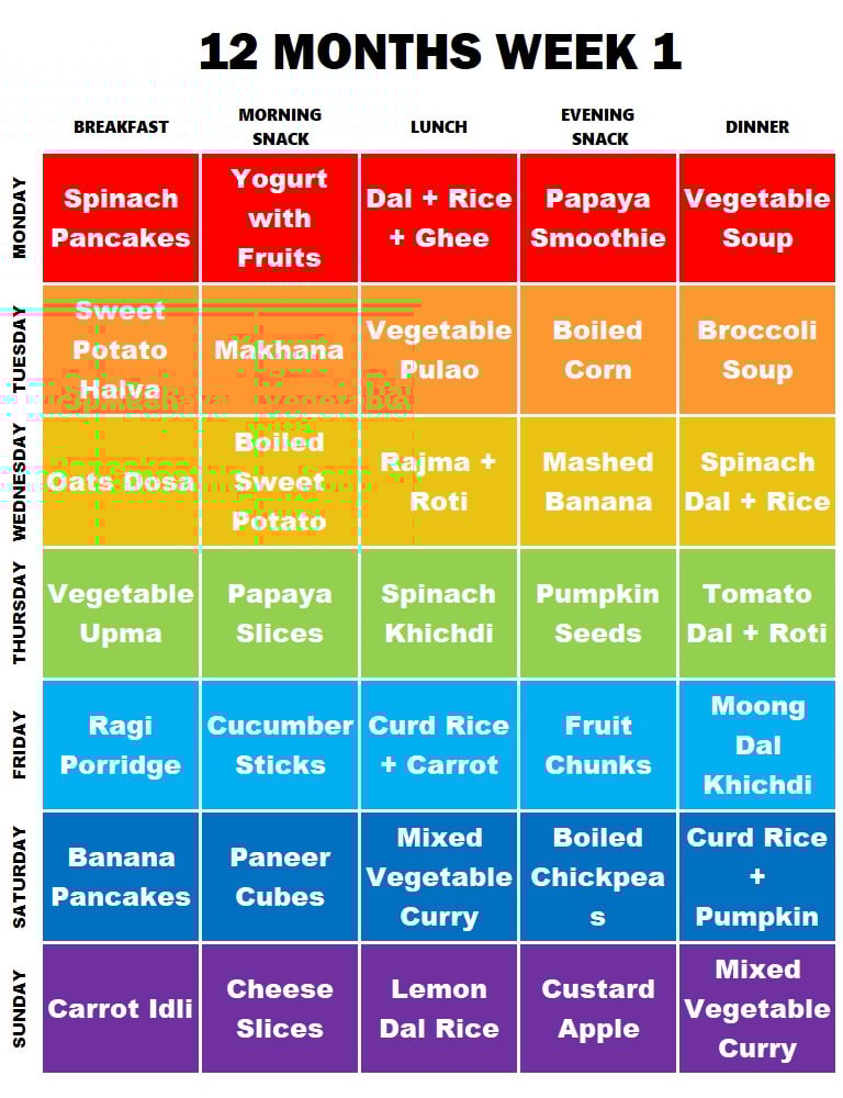 **NOTE: This is just a reference Meal Plan. You can change any item according to your needs and preferences. Babies should continue to consume Formula Milk/Breastmilk apart from these. You can also replace any snack with milk, if the baby is not having milk after eating.