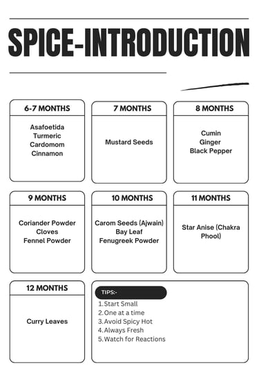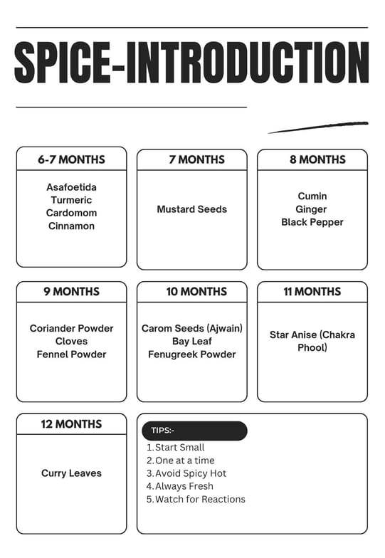 Introducing spices to babies is an exciting milestone in their food journey. Not only does it add variety to their diet, but it also helps in developing their palate, enhancing digestion, and promoting overall health. However, this process must be gradual, careful, and aligned with the baby's age and tolerance levels. Here's a detailed guide to introducing spices to your baby, as depicted in the chart above.