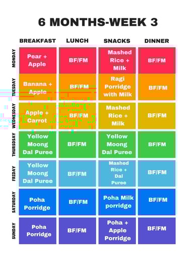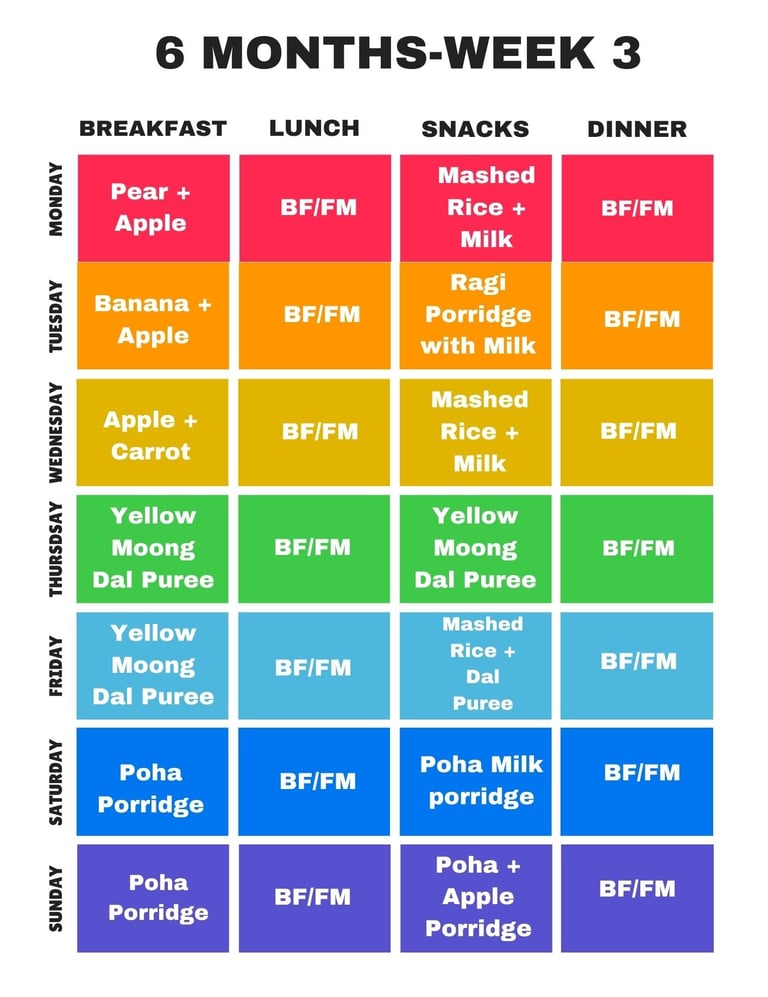 The third week adds foods like moong dal puree, mashed rice with milk, and poha porridge to include a mix of textures.