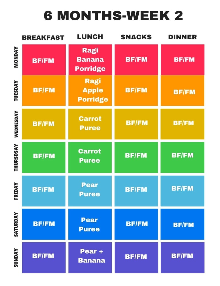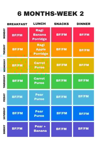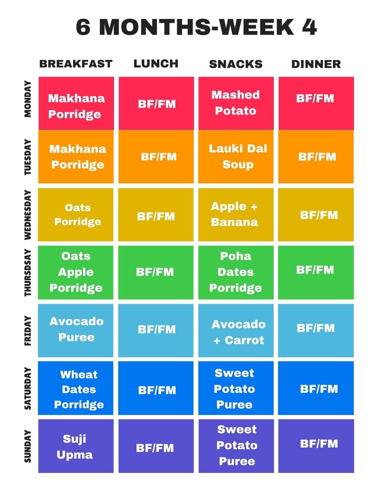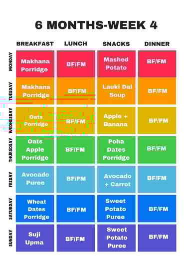 The final week introduces nutrient-dense foods like makhana porridge, avocado puree, and oats with fruits.