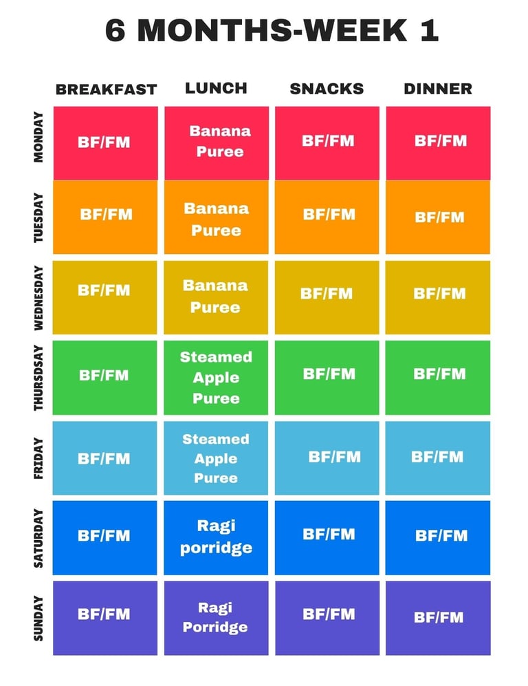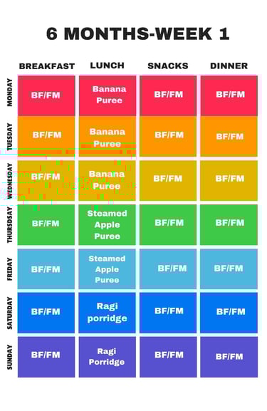 In the first week, the focus is on introducing single-ingredient purees like banana and steamed apple.